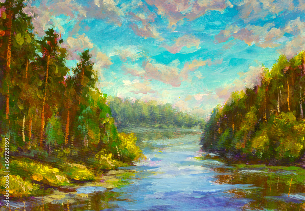 Oil Painting Art Wall Decor Acrylic Artwork Poster Watercolor Drawing Modern Style Fine Art Beautiful Russian Landscape Beautiful Landscape Blue River Among Green Forest Summer Nature Stock Illustration Adobe Stock